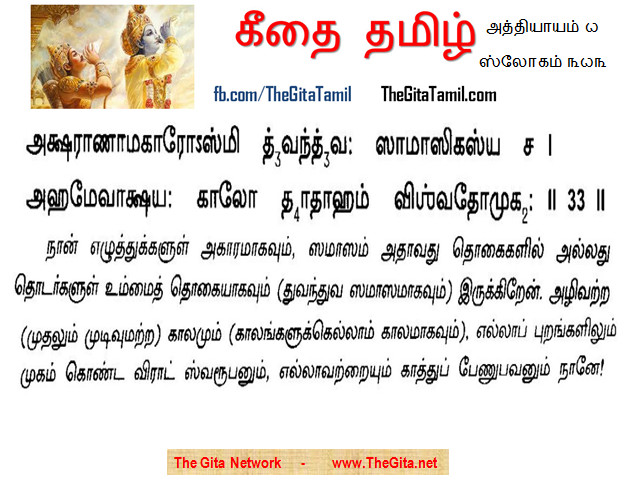 рдореИрдВ рдЕрдХреНрд╖рд░реЛрдВ рдореЗрдВ рдЕрдХрд╛рд░ рд╣реВрдБ рдФрд░ рд╕рдорд╛рд╕реЛрдВ рдореЗрдВ рджреНрд╡рдиреНрджреНрд╡ рдирд╛рдордХ рд╕рдорд╛рд╕ рд╣реВрдБ, рдЕрдХреНрд╖рдп рдХрд╛рд▓ рдЕрд░реНрдерд╛рддреН рдХрд╛рд▓ рдХрд╛ рднреА рдорд╣рд╛рдХрд╛рд▓ рддрдерд╛ рд╕рдм рдУрд░ рдореБрдЦ рд╡рд╛рд▓рд╛, рд╡рд┐рд░рд╛рдЯреН┬ард╕реНрд╡рд░реВрдк рд╕рдм рдХрд╛ рдзрд╛рд░рдг-рдкреЛрд╖рдг рдХрд░рдиреЗ рд╡рд╛рд▓рд╛ рднреА рдореИ рд╣реА рд╣реВрдБ редред рейрей редред