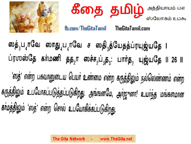 ‘सत्’ ——-इस प्रकार यह परमात्मा का नाम सत्य भाव में और श्रेष्ठ भाव में प्रयोग किया जाता है तथा हे पार्थ ! उत्तम कर्म में भी ‘सत्’ शब्द का प्रयोग किया जाता है ।। २६ ।।