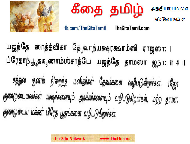 सात्विक पुरुष देवों को पूजते हैं, राजस पुरुष यक्ष और राक्षसों को तथा अन्य जो तामस मनुष्य हैं, वे प्रेत और भूत गणों को पूजते हैं ।। ४ ।।
