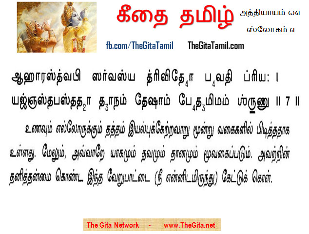 O Arjuna, even one of the most important necessities in life for all beings, namely food, belongs under three categories. Similarly, customs such as religious sacrifices, all acts of self-discipline, and self-restraint as well as the giving of gifts, can all be individually placed under three separate divisions.